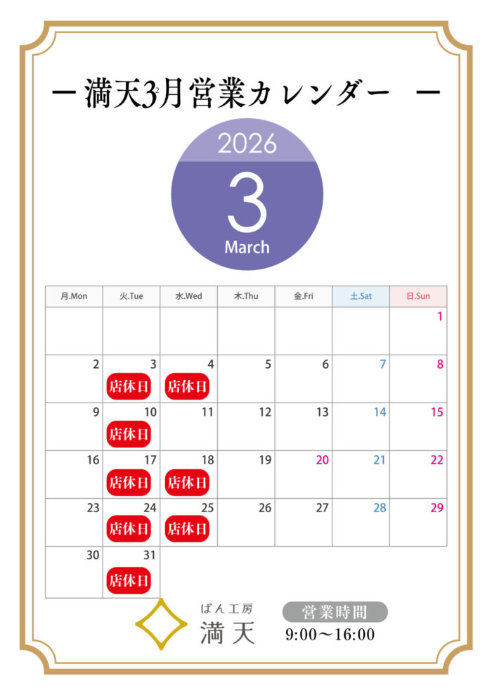 3月の営業日をお知らせします。
